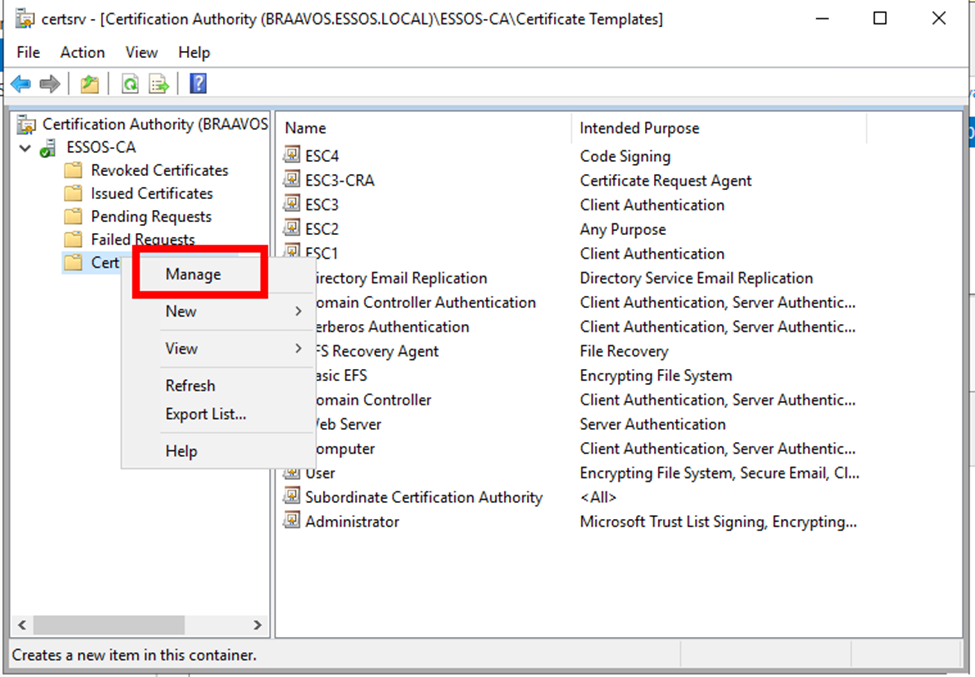 # ESC1, Certificate Templates, Public Key Services, Services, Configuration, es