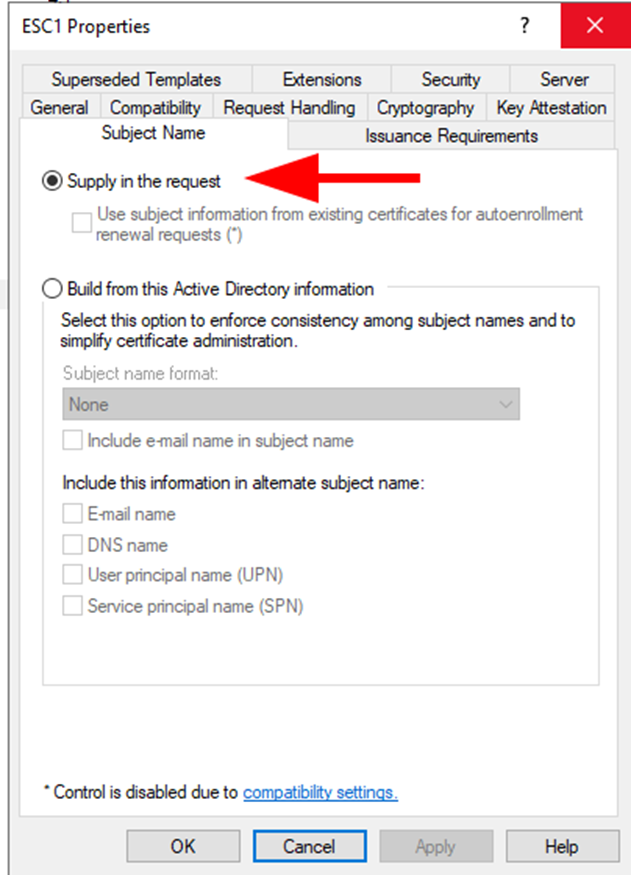 - Review and Audit Certificate Templates: Regularly check templates for misconfigurations. Use a tool like certipy (Linux) or certify (Windows) to periodically audit AD CS templates. Specifically, review templates for the ENROLLEE_SUPPLIES_SUBJECT flag. This allows the requestor to specify the alternate SAN. This flag is controlled by the Supply in the request configuration option.