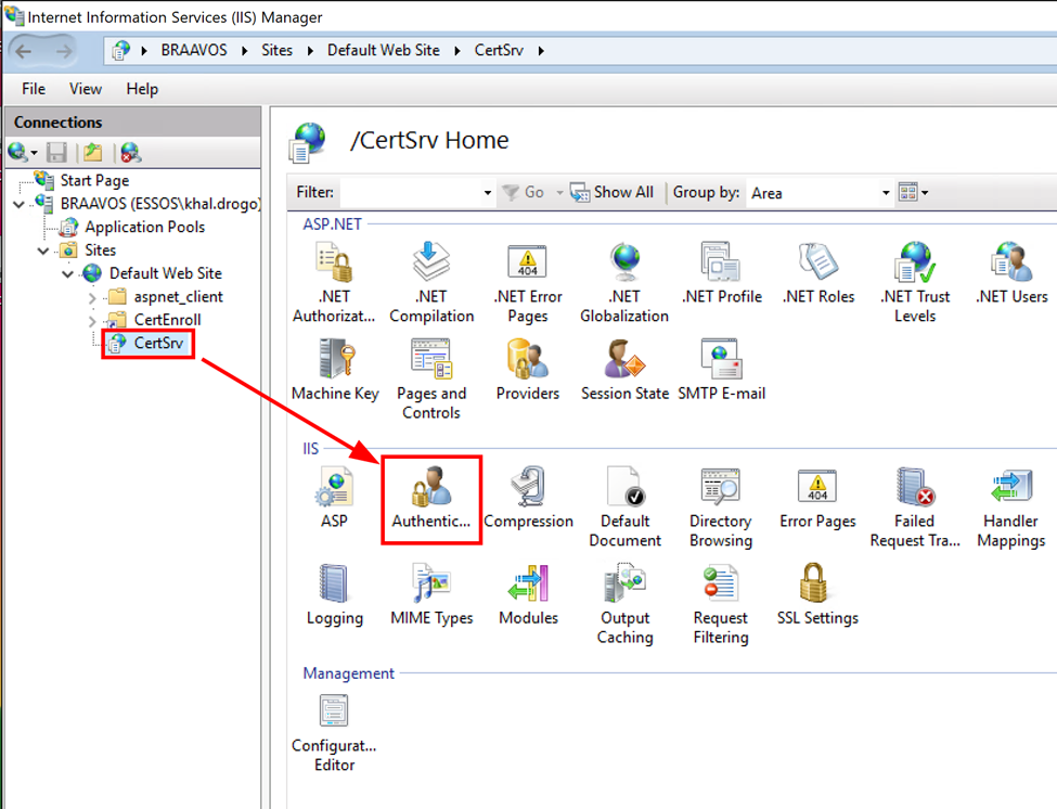 To enable EPA on the web enrollment endpoint, open the IIS Manager application and select "Authentication" for the "CertSrv" site, as shown below: