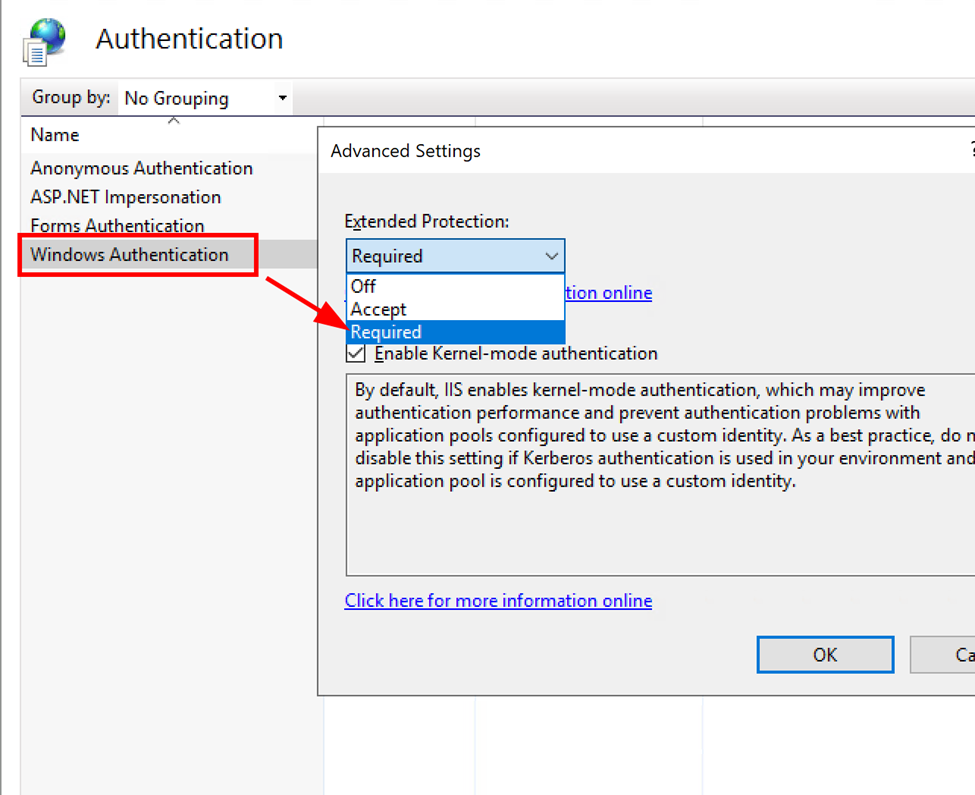 From within the Authentication menu, right-click on "Windows Authentication" and select "Advanced Settings". Then, under "Extended Protection" select "Required" as shown below: