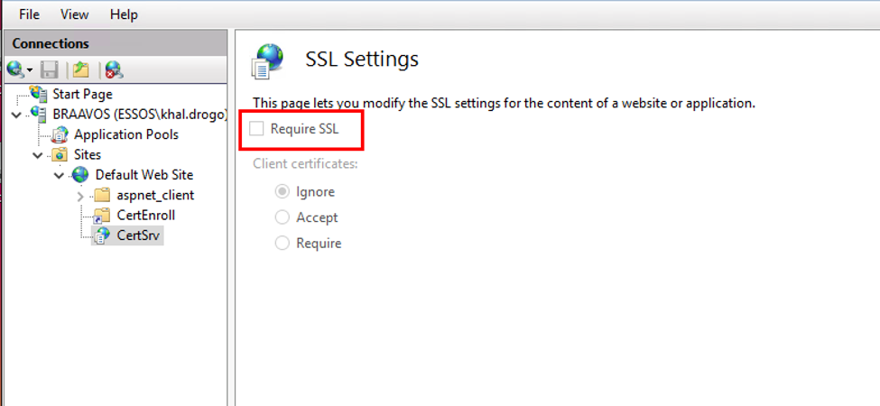 To enable HTTPS, select the "SSL Settings" for the CertSrv site, and check "Require SSL".